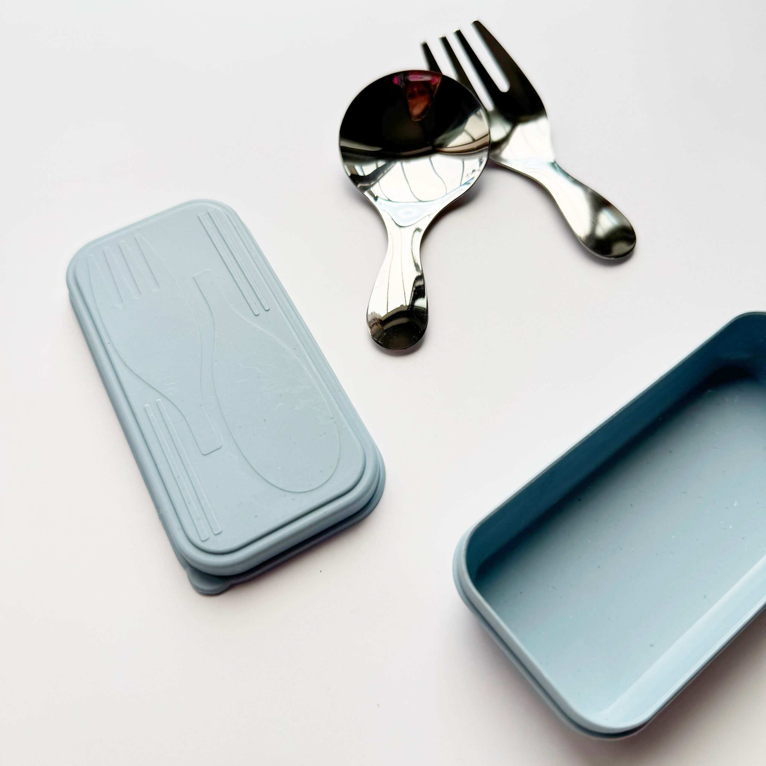 Zestaw sztućców (widelec i łyżka) wykonanych ze stali nierdzewnej w pudełku. Bez problemu zmieścisz je w śniadaniówce.