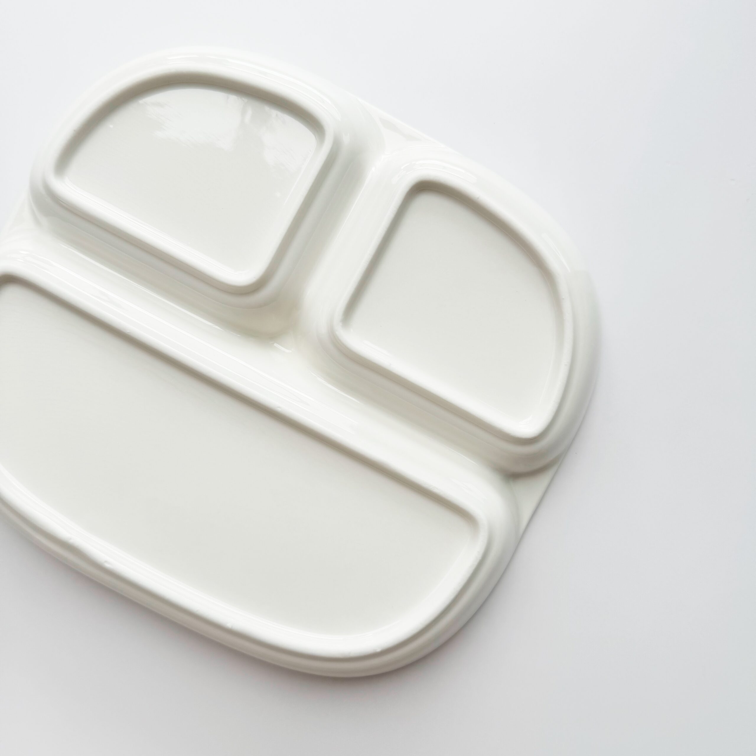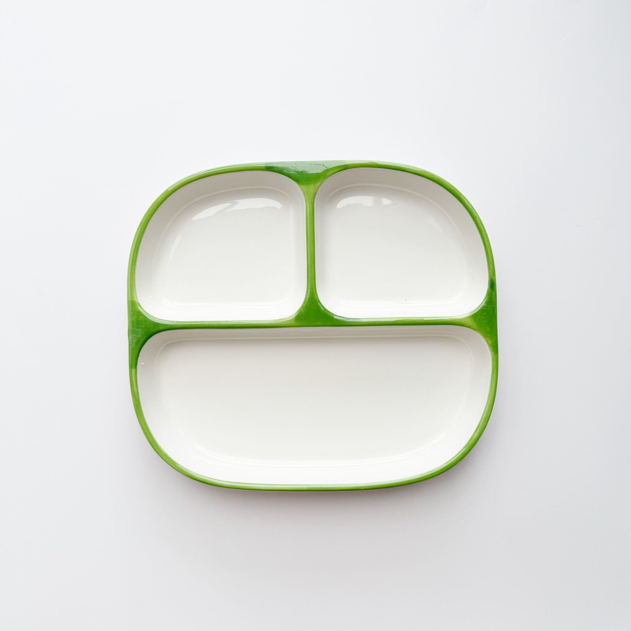 Talerz obiadowy trójdzielny wykonany z wypalanej ceramiki w kolorze białym z zielonym wykończeniem. Podział talerzyka pomaga ustalić wielkość porcji dla każdej grupy żywności, ułatwiając przestrzeganie dziennego zapotrzebowania na makroskładniki. Talerz dedykowany jest dla dzieci w wieku przedszkolnym i starszych, których posiłki nie lądują już na podłodze 🙂